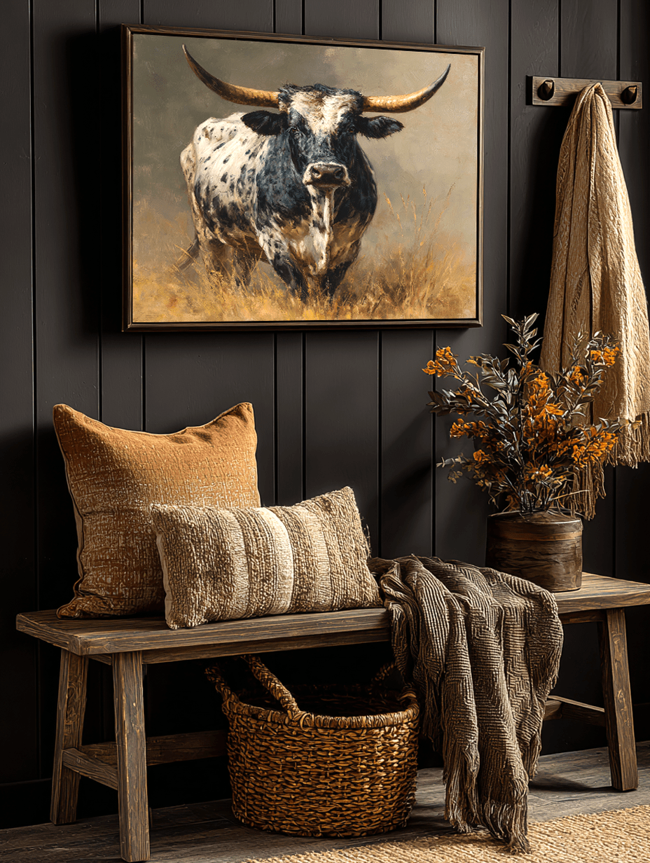 Shop NowStrong, stoic, and undeniably Western — this striking longhorn canvas captures the rugged beauty of ranch life in timeless black and white.