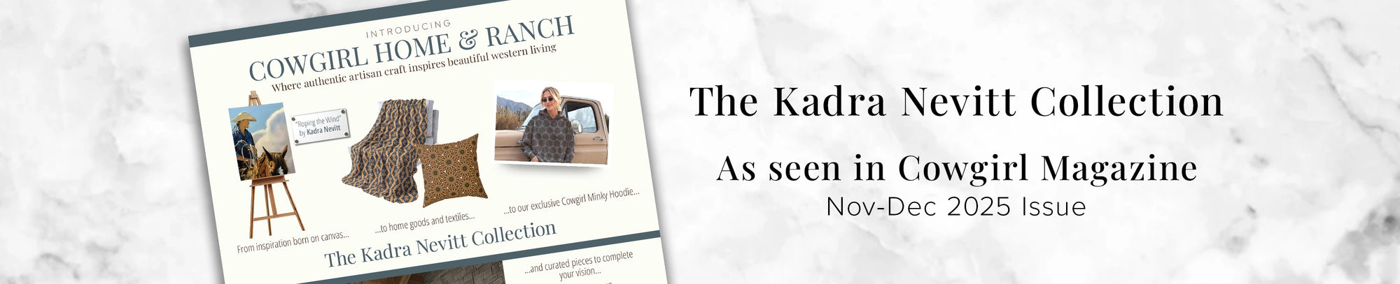 Discover the authentic spirit of the American West through the masterful pastels of Kadra Nevitt, a nationally recognized artist whose work graces prestigious galleries including the renowned Mountain Oyster Club. With over 30 years of artistic dedication, Kadra captures the untamed beauty of western landscapes and the timeless stories of those who call the range home. Her soft realism technique brings atmospheric depth and emotional resonance to each piece, transforming moments of western life into heirloom-quality art. Exclusively licensed to Cowgirl Home and Ranch, the Kadra Nevitt Collection features her celebrated canvas "Roping the Wind" alongside thoughtfully designed coordinating accessories that extend her artistic vision throughout your home. Each piece reflects Kadra's commitment to authentic storytelling and her deep connection to the western lifestyle, offering you the opportunity to own gallery-quality art from one of today's most promising western artists.